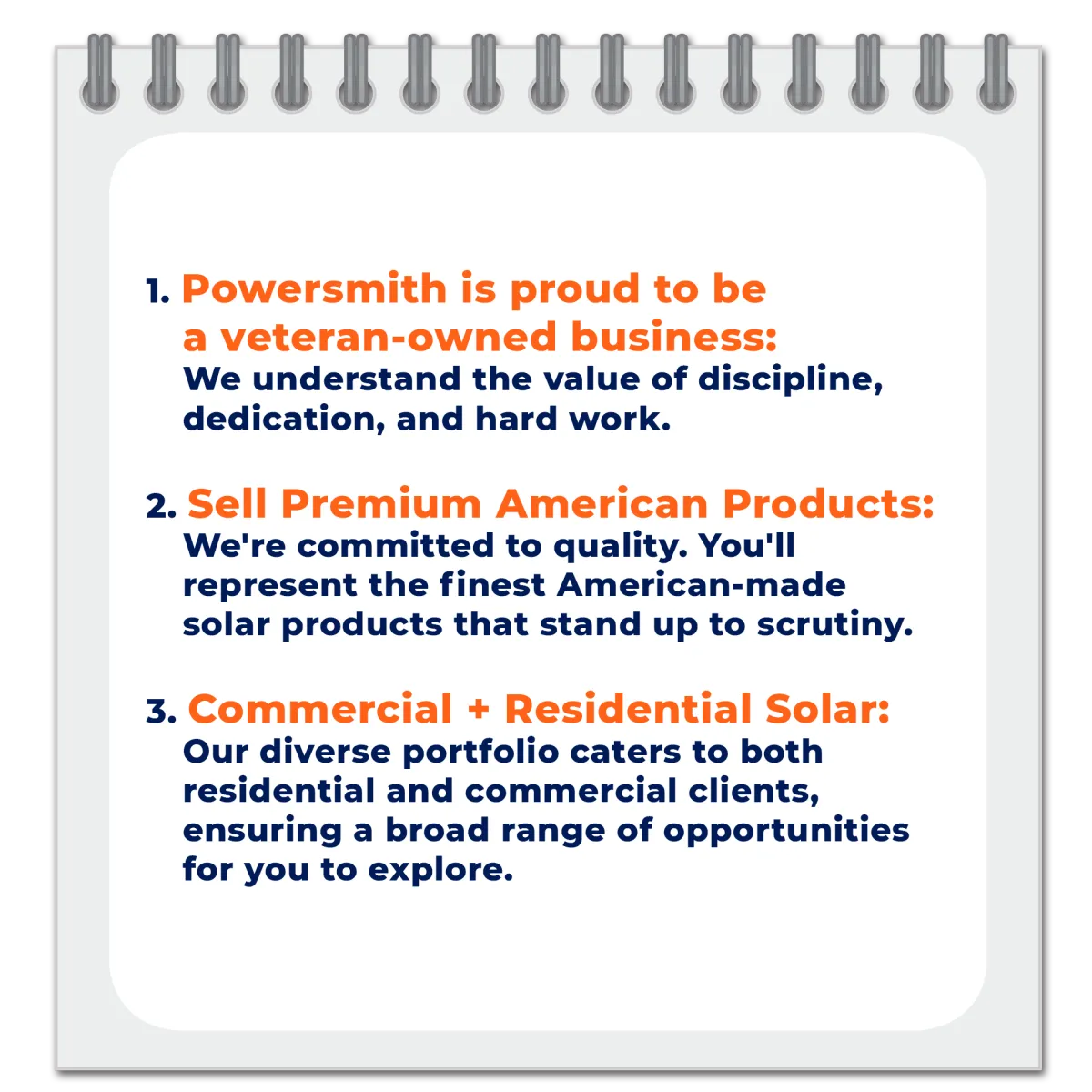 Look no further! Powersmith, a veteran-owned premier solar sales company, is here to offer you an opportunity like no other. With operations in 29 states across the USA, we're more than just a solar company; we're your path to a bright and rewarding future in solar sales.